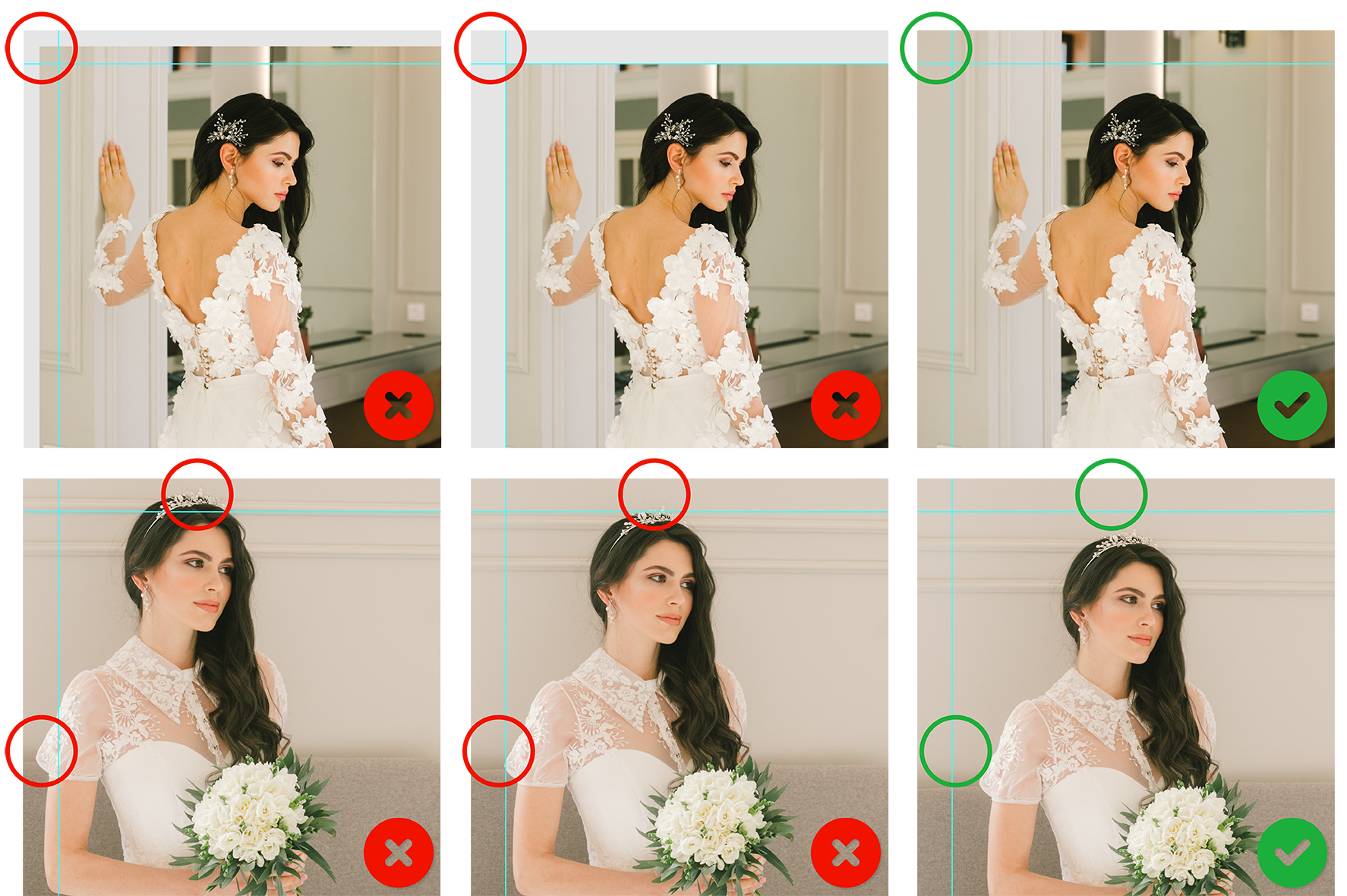 The templates available for layouts in all available measures, already include all around guides with approximately 0.5 cm(Fineart = 0.8 cm) as safety margin, what is outside these guides is called "Bleed" and if necessary can be cut. Do not place people or objects within the area of the "Bleed" that could distort the direction of the image if they are cut, you can check the correct way of drawing a layout on the image beside.