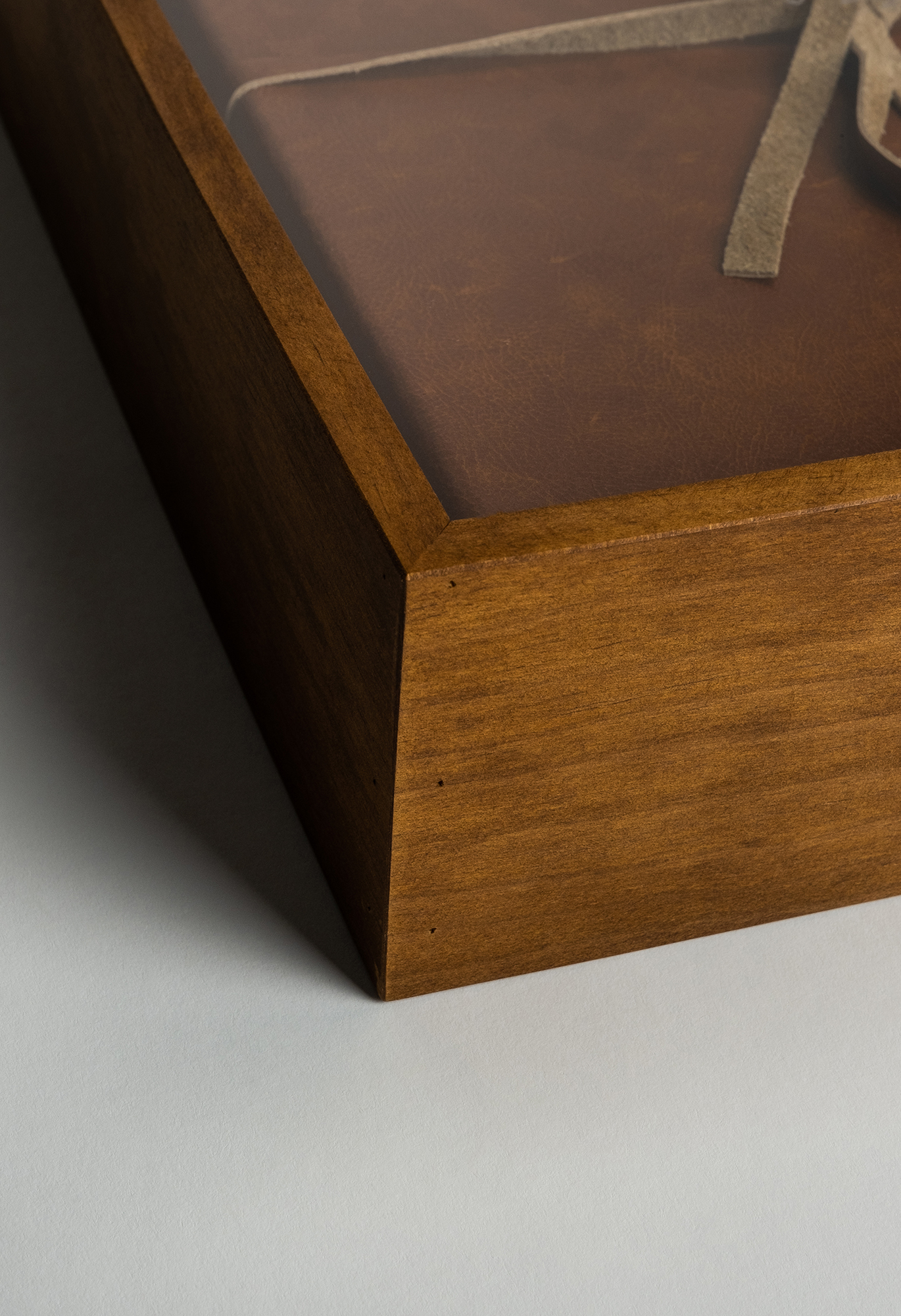 Wood Clear Box is the prototype of minimalist beauty. This product features a sliding acrylic cover that allows you to see the album it holds. Handcrafted, it offers a choice of light or dark wood tones, according to the customer's choice. This cover also allows customisation in laser engraving and UV printing on the lid or inside the box, always keeping the product simplicity.